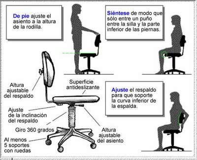 8.- Se recomienda que la mesa de trabajo tenga una altura de entre 70 y 75 centímetros y que la silla tenga un buen apoyo en la zona lumbar y que sea regulable en altura e inclinación. La silla debe quedar de tal manera que los codos formen un ángulo recto con el teclado.