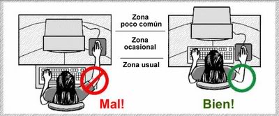 7.- Ubique el mouse cerca del teclado. Evite además la sobrecarga de la extremidad superior derecha. Por ejemplo, puede usar el mouse en el costado izquierdo del teclado.